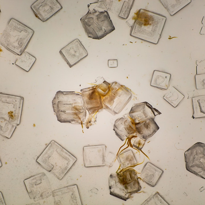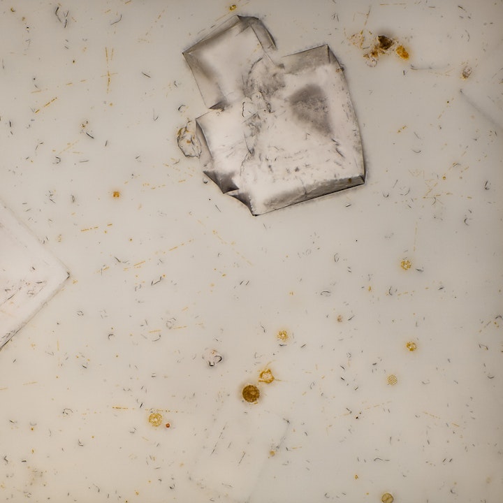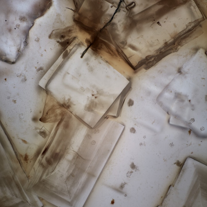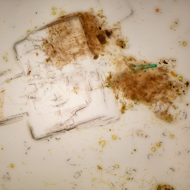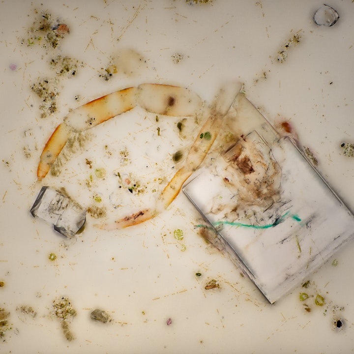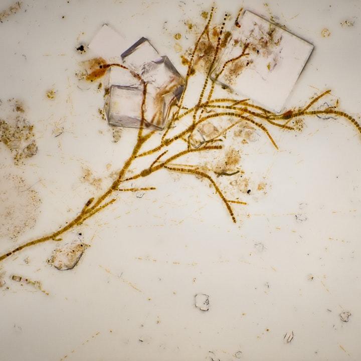 Water is a peculiar molecule with properties like no other substance. Equally fascinating is the diverse and abundant lifeforms as phytoplankton, that we can’t see with the naked eye. Like a parallel universe within our own. These things made me curious about the microscopic world of water. The images in this series shows the remains of solid material left when the seawater evaporated. A mixture of salt crystals, organic matter and in some of the images, plastic fibers.